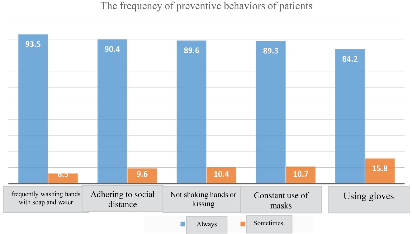 More than 80% of the participants had a favorable status in performing preventive behaviors in the study, which is in line with the results of Andarge et al (20). These researchers measured the intention and personal preventive measures against the prevalence of COVID-19 in adults with chronic illness in southern Ethiopia with the Theory of Planned Behavior. It is of note that, in this study, more than half of the participants followed preventive behaviors. In another study, Zhong et al (21) investigated knowledge, attitudes, and practices toward COVID-19-preventive behaviors among Chinese residents, whose behaviors were reported to be undesirable. Among these behaviors, frequent hand-washing with soap and water was the most common, while using gloves was the least frequent behavior. Further, other studies showed the positive effect of using protective equipment such as masks and gloves in preventing infection (22,23). In the study of the relationship between demographic variables and preventive behaviors among the participants, a significant relationship was identified between gender, marital status, and level of education with preventive behaviors, which conforms to the result reported by Zhong et al (21).