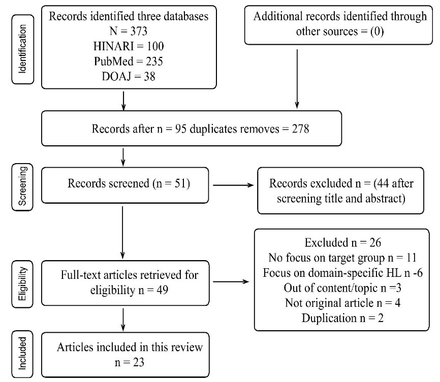 The review of the literature yielded 373 articles (Figure 1). Overall, 278 articles were removed after identifying duplicates, and a total of 44 articles were screened and reviewed for abstracts, and 49 articles were retrieved for full-text reviews. After reviewing the full text, 26 articles were excluded, and finally, 23 full-text articles were reviewed according to 373 database searches. Among the selected papers, 21 papers were assessed for research question 1 such as measures and the AHL level, and 15 papers described its relationship/association with HP (research question 2).